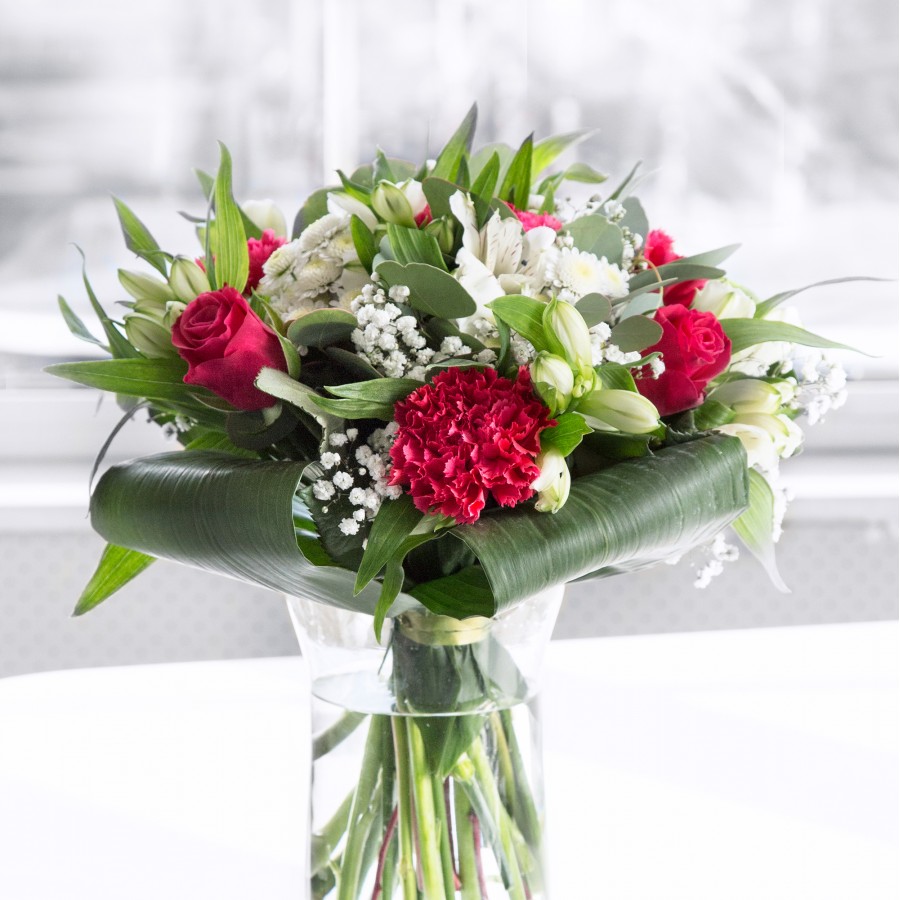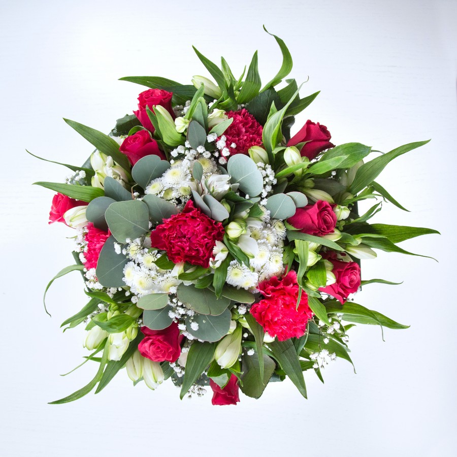 Celebrate elegance with our Majestic Red & White Bouquet. This striking arrangement combines vibrant red roses with pristine white chrysanthemums and gypsophila, complemented by elegant alstroemeria and rich aspidistra leaves.